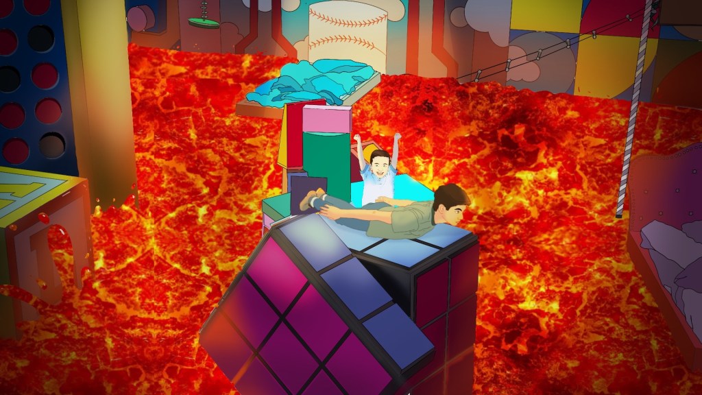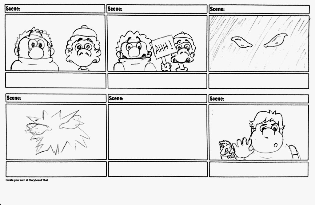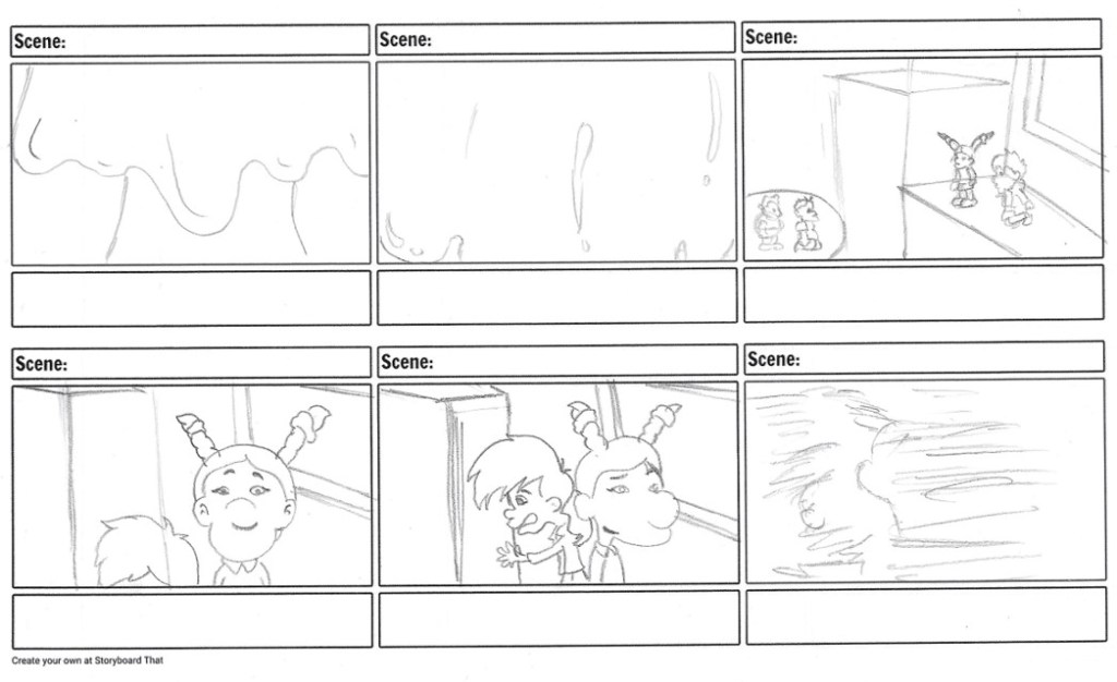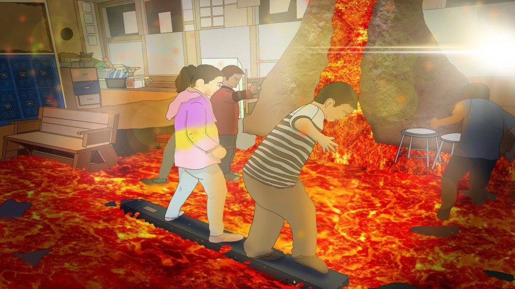 However, I recognized that solely focusing on character interactions with the furniture might undermine the impact of the erupting “lava.” To counter this, I strategically introduced the interior of the school with a compelling scenario. Two characters ingeniously navigate the perilous “lava” by floating on a cushion and using it as a makeshift raft. Their interaction with the surrounding environment showcases their resourcefulness and introduces the class pet, Lizzy, through an unexpected collision with her cage. This not only enhances the narrative coherence but also adds depth to the characters’ motivations.