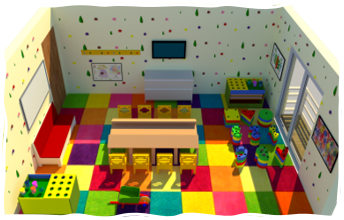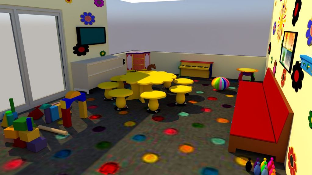 To complement the visual dynamism, I meticulously honed the character movements, ensuring that every gesture and action remained engaging. This approach was underpinned by the intention of holding the audience’s attention while catering to their inherently short attention spans. The narrative involves a playful rendition of ‘the floor is lava,’ prompting the need for multi-level structures that facilitate the characters’ avoidance of the ground. Consequently, I thoughtfully integrated strategic locations that would serve as jumping points and platforms for their interactions. These spaces were also meticulously furnished with preschool essentials such as sofas, tables, and play areas.