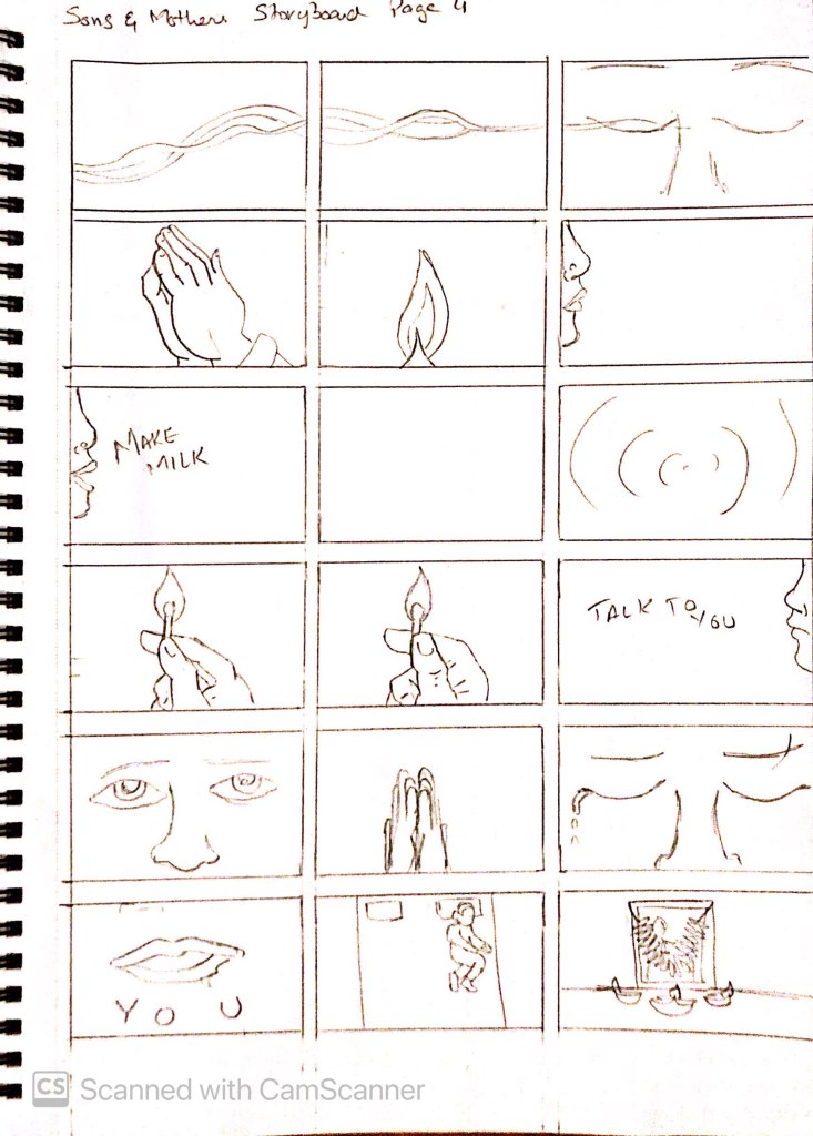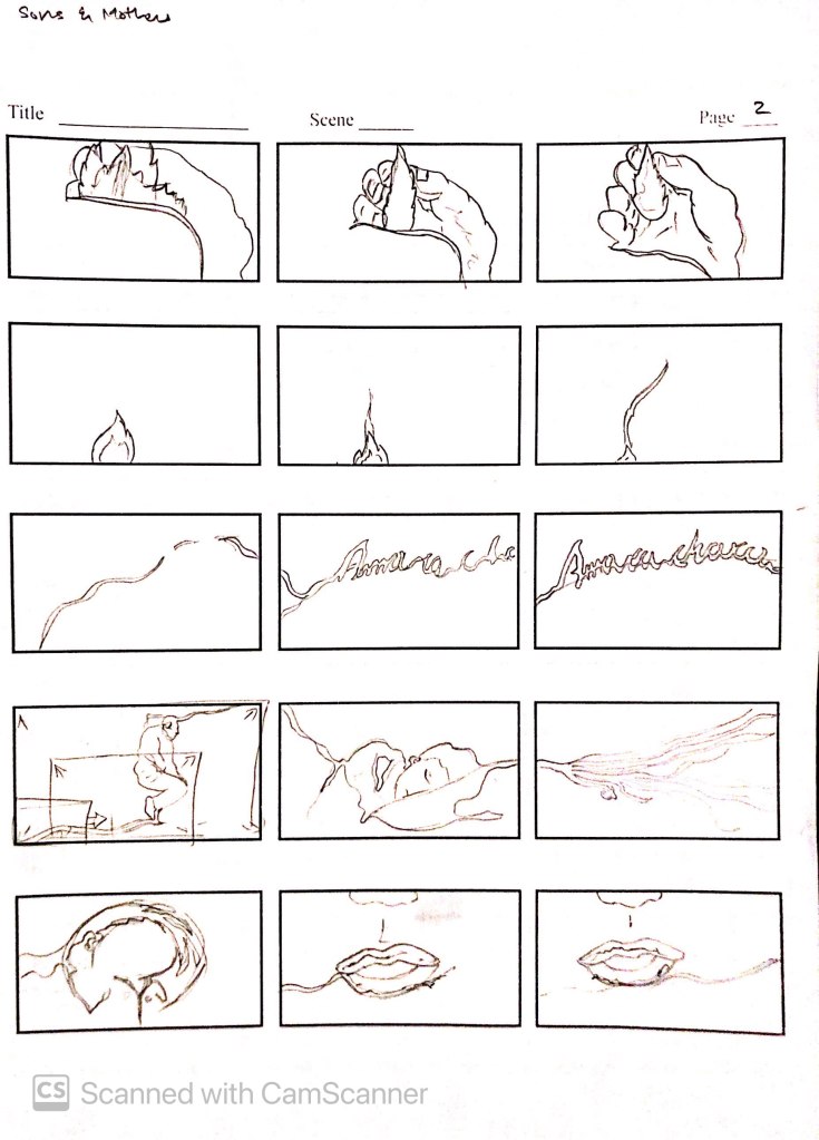 We are in a dark room and we see someone lighting a match. A hand appears from the pitch dark and lights a diya. We start to follow the smoke trail from the candle fire. The smoke itself is a character and it keeps transforming in to different objects. Not only this but the smoke is traveling throughout the room and showcasing what a mess the son is. The smoke trail in a way acts as our camera and travels 360 degrees in the room and connects back in to the fire from where it first emerged. We cut to a shot of a picture frame that contains a portrait of him and his mother (as this symbolizes that he is mourning lost times). There is a flower necklace around frame, similar to Hindu tradition when they mourn the departed.
