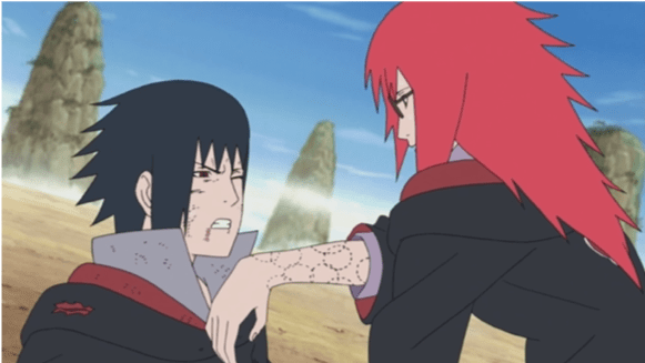 Karin Uzumaki (Red) was in love with Sasuke Uchiha (Blue) and despite knowing about her unrequited love, he used her to regain his powers. Whenever he ran out of chakra he would bite her arm to take some of her chakra and heal himself. Despite being a tough, smart and independent woman Karin’s passion and selfless (red) love for Sasuke made her weak who was just selfishly (Blue) using her.