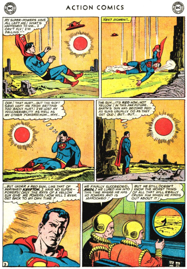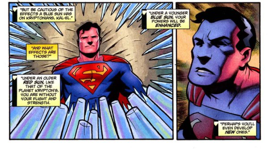 Even his suit is made up of three colors: red, blue and yellow. These colors portray how the different colored suns effect him. Blue is used most widely because of its positive impact, red is the second most used color because of its negative impact on him and yellow is the least used as it has little to no effect on his superpowers.