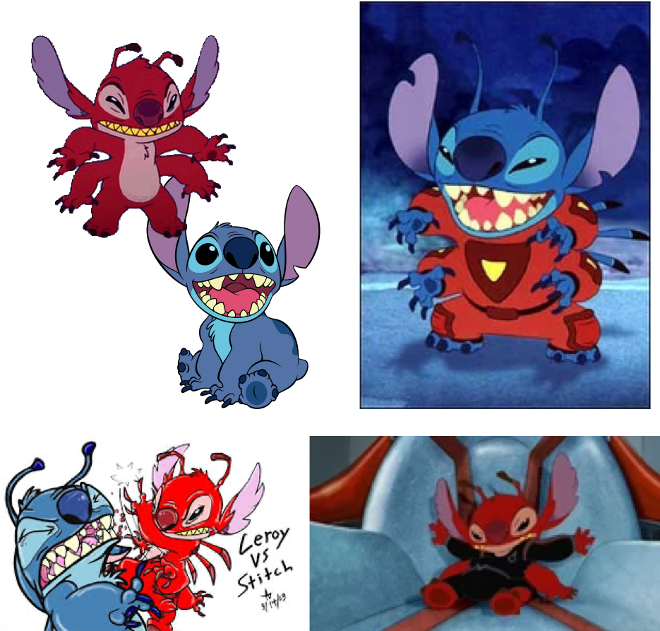 Whereas, his twin brother Leeroy, a red alien who looks exactly like Stitch is sent to fight him. He is the antagonist. He is seen to be ruthless, destructive with no emotion to be seen. He is considered to just be a destructive machine who is loyal to his creator. Leeroy is mischievous, harmful, aggressive, sadistic and cruel with no morals. Unlike stich he is more mature, merciless, brutal and enjoys torturing others. Leeroy is also strategic, smart and cunning as he uses proper strategies for battle unlike Stitch who acts on impulse. The two contrasting personalities of similarly built characters and their portrayal through different colors used symbolically to portray the protagonist and antagonist is evident in this example.