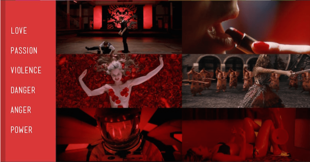 An inspiration would be stanely kubrick who would use colours and environments to depict the characters mood and traits e.g. In eyes wide shut blue and not so much red but amber play a key role in highlighting the difference between the cold world out side the couples relationship and the warm safe world they start off in. You can see the blue creep more and more into their home throughout the film and the amber is used to create warm safe havens that can also give way to the blue when truths are revealed and characters reveal their true colours. It’s part of the films powerful psychological narrative, you don’t need to notice it for it to effect the way you feel. In the other of his films you gave examples of there wasn’t that much use of those colours beyond creating contrast and dramatic imagines and using red for danger etc but they certainly had their own colour schemes and meanings. I always felt there was something delicious about giving Alex and his droogies white outfits seeing as white is so often used to connote innocence. I think in a way there was something innocent about them which is another meaning in the film, they were who they were, unlike the society they were in which had its own deceitful, hypocrisy and agenda.