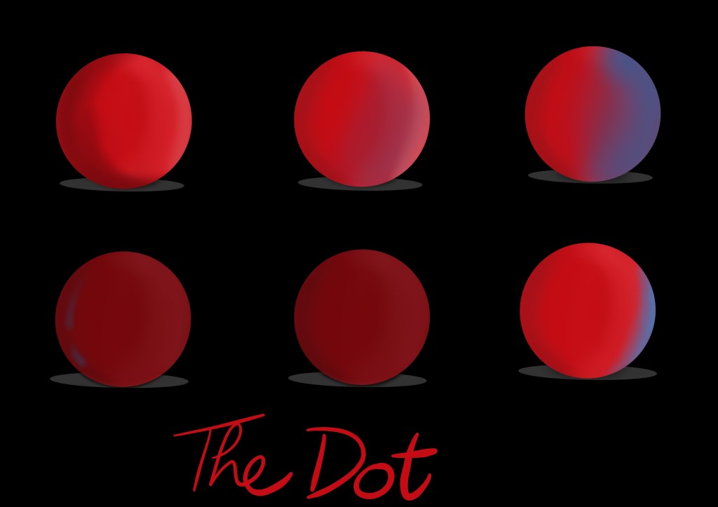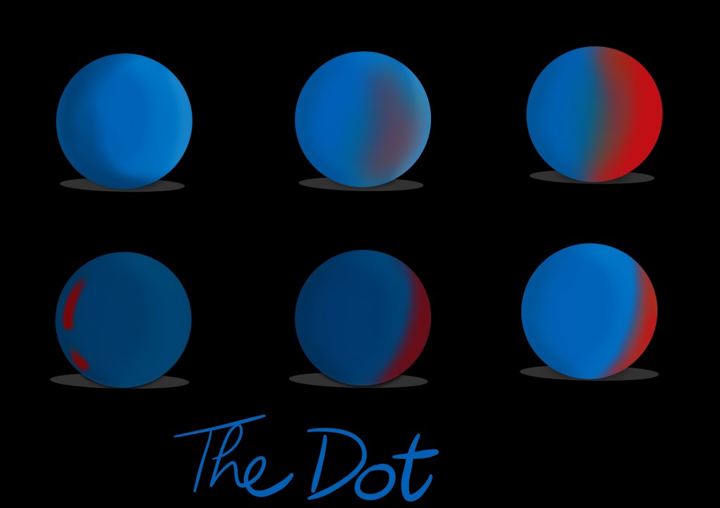 I think the colour red better suits the dot as it gives it more of characters. Gives it a warm feel while the blue colour feels a bit more energetic and accordinng to the story is better suited for the line.