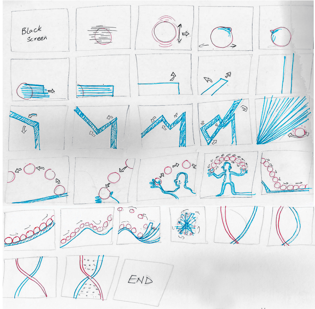 The story starts when show a red dot roaming around, living a carefree life and starts to feel a bit unwell. the dot goes a bit of haywire and a line burts out from it. The line although at first is seen as a new born, but it quickly breaks the norm and starts to learn more about itself. Learns that it could bend and before you know it goes on a war with the dot. The line plays around with the dot and eventually they both start to mix and inter twine to become a dna strand and they keep on replicating. This story is basically about life starts and continues.